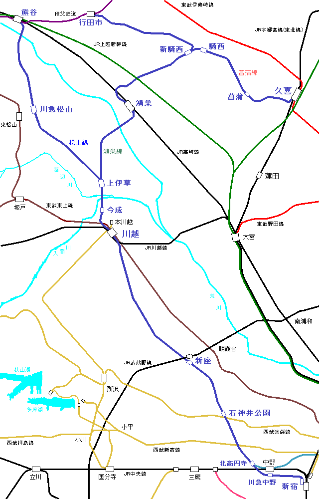 上の図で、濃い目の青い線が川越急行鉄道の路線を表しています。駅名も同じ色にしてあります。黒い線はJR在来線、緑の線はJR東北・上越新幹線、その他の色付きの線は私鉄路線(一部省略)を、水色の部分は主な河川・湖沼を、それぞれ表しています。